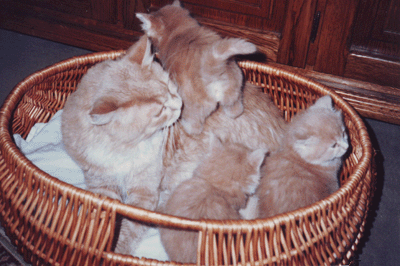 ... 20 Jahre später gibt es das Körbchen immer noch ... die Kitten von Charmira sind von Larry genau nur einen Stammbaum (4 Generationen) weit entfernt ...