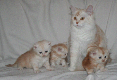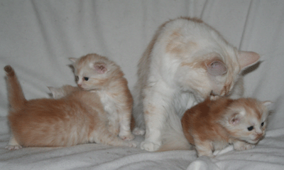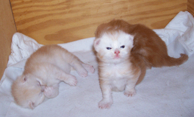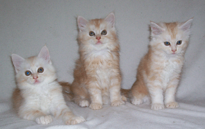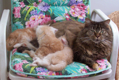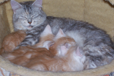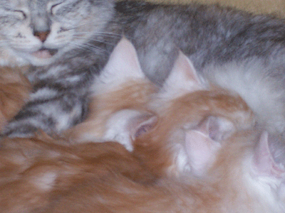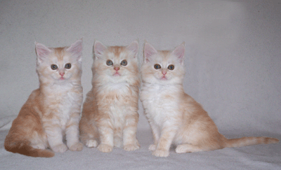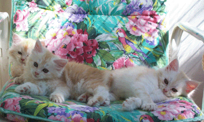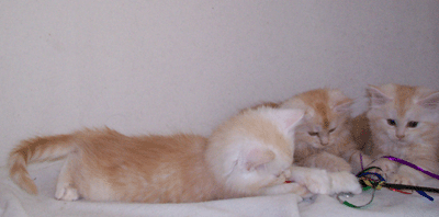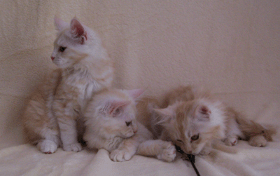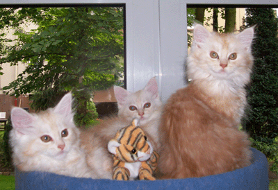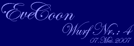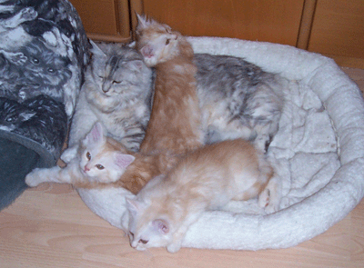... EveCoon Wurf Nr.: 4 am 03.06.2007 mit 4 Wochen. Alle folgenden Fotos mit 3 und 4 Wochen sind von Michael von den Metal Coons - vielen Dank dafür Michael. v.l.n.r. Rumpleteazer Ratzmataz Munglejerry
