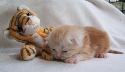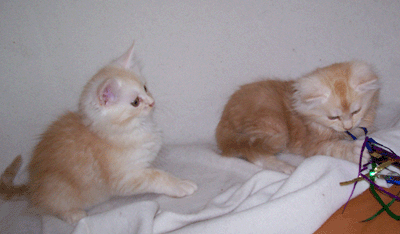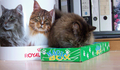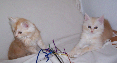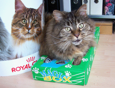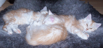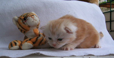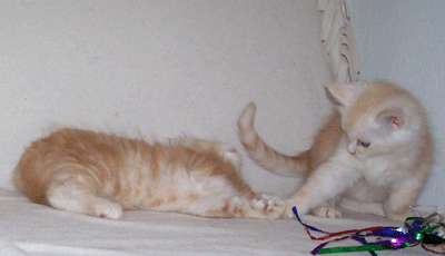 Munglejerry (rechts) ging es wirklich sehr, sehr schlecht. Er ist aber jetzt wieder gesund - ist nur ziemlich hinter seinen beiden Geschwistern zurück geblieben. Jetzt gibt er richtig Gas und holt gerade ganz schnell auf ... :-) Er hat ein ausgesprochen sanftes Gemüt. Seine Geschwister spielen jetzt wieder mit ihm - aber immer noch gaaaanz vorsichtig und rücksichtsvoll. So sind Coonies eben!