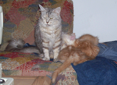 Rumpleteazer (“der Silberling” hinten links) macht überhaupt keine Anstalten weggehen zu wollen. Er ist (obwohl potent) im Rudel und bei Sam sehr gut gelitten. Seine Lieblingsbeschäftigungen: alle zum Lachen bringen und mit Jingle Bells knutschen ...