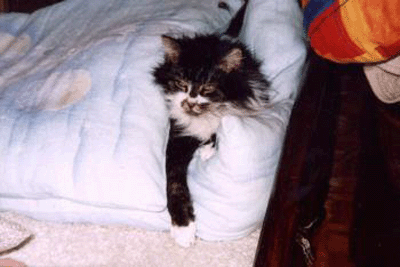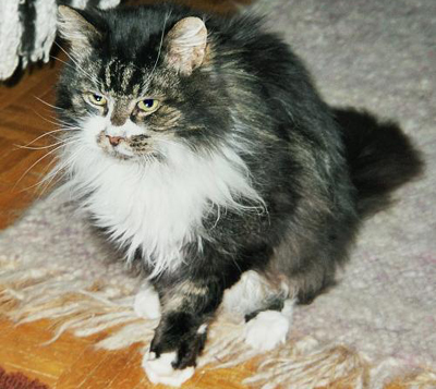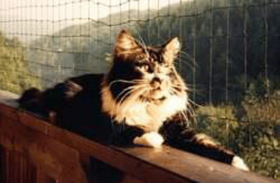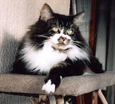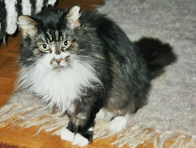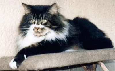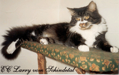 Europa Champion Larry war in seiner Zeit DER bekannteste Schindetal-Kater. Er hat ganze Linien begründet und ist daher einer der wichtigsten Kater, die ich je hatte. Was über Larry gezogen ist, ist derart pumperl- gesund, daß heute noch sehr nach Larry-Nachzuchten gesucht wird. Er führte bis zu seiner letzten Stunde ein beschauliches Leben mit “seinen” alten Mädchen. Um 22 Uhr verlangte er noch nach seinem Frischfleisch - aber bitte “bester Schnitt”. Seine Zähne und seine gesamte Konstitution waren so hervorrragend; nichts deutete auf sein nahendes Ende. Wir sind alle sehr betroffen und traurig.
