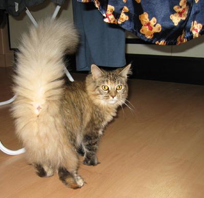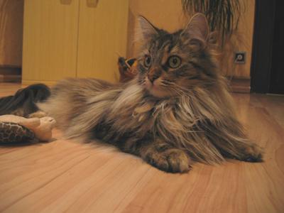 Lucy ist die einzige Katze, die ich kenne, die aus dem Stand auf meinen Schrank springt (ca. 2,40 hoch). Sie ist eine sehr schlanke und leichte aber super muskulöse Katze ... und Fell hat sie ... ein echtes “Zottelmonster”.
