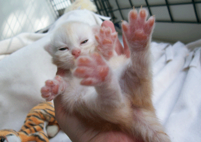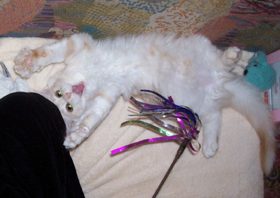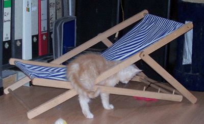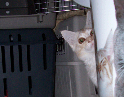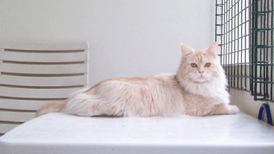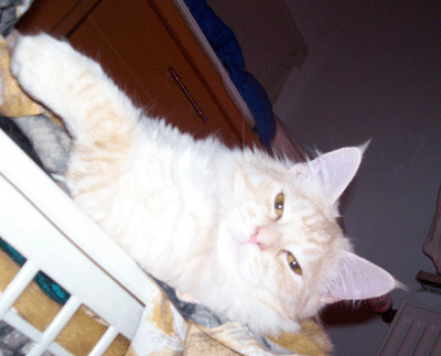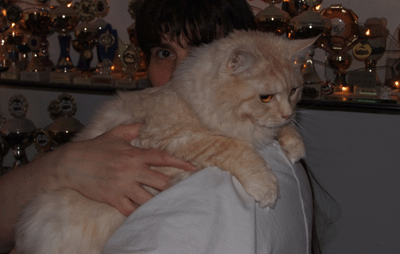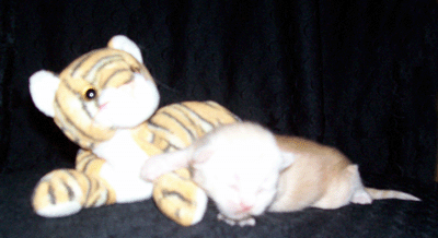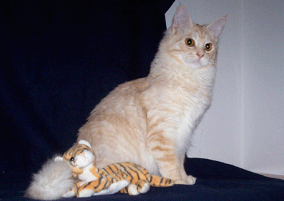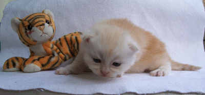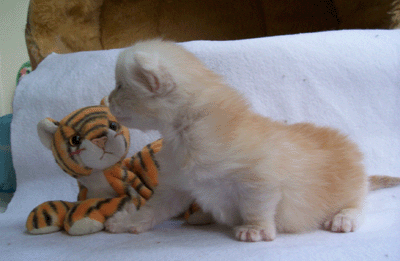 Tiger ist ein Kater, der bei der Geburt auf red smoke bestimmt wurde, jetzt ist er jedoch soweit aufgehellt, daß er auf (hot) creme smoke umbestimmt werden mußte.