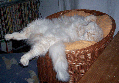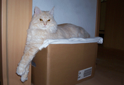 Rumpleteazer im Mai 2009 gemütlich auf der Zoo-plus-Lieferung ausspannnen und träumen ... vielleicht gibt es ja was leckeres da darin ...