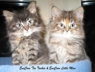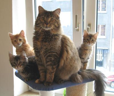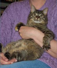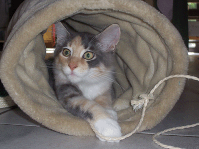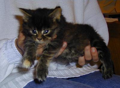 Die ersten 3 Wochen seines Lebens hat Tucker als Mädchen verbracht. Als aber sein Vater Sam eines “seiner Mädchen” anders - irgendwie grober - behandelte, wurde ich stutzig ... also gucken was der kleinen Motte fehlt ... nichts, nur irgendwie seltsame Farbe auch für ein Mäd..., hä, ein Junge !?! Na, damit hatten wir nicht gerechnet! Also Donnerstags Geschlechtsbestimmung beim Tierarzt, Freitags Farbbestimmung beim Verein ... fertig war die Überraschung: ein Torbie-Kater ... welch ein großes Glück!