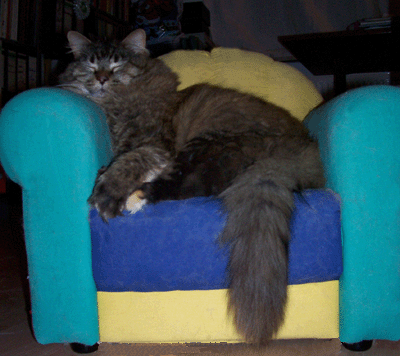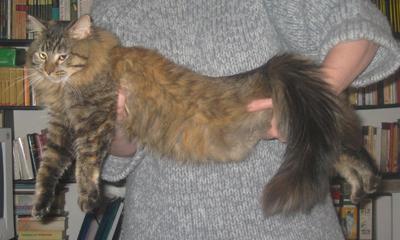 Nun, und dann wurde aus meinem Tuckerli doch noch ein Maine Coon. Die Kater-Gewichtsklasse hat er nie erreicht, war aber mit fast 7 Kilo nicht schlecht dabei. Später nahm er aber wieder ab. Das hohe Gewicht tat seinen Knochen nicht gut.